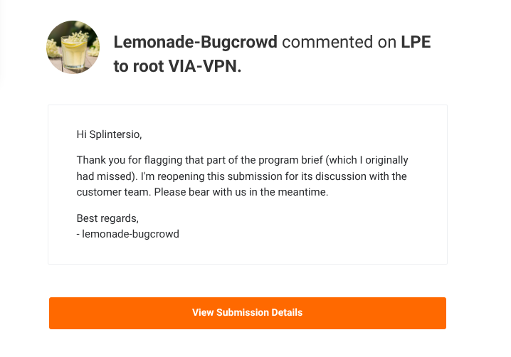 I check the scope, I submit my nicely formatted submission, screen recording, LPE PoC, nice. now I just need to sit back wait for some pat on the back and a random amount of money be offered to me for my time and creativity.