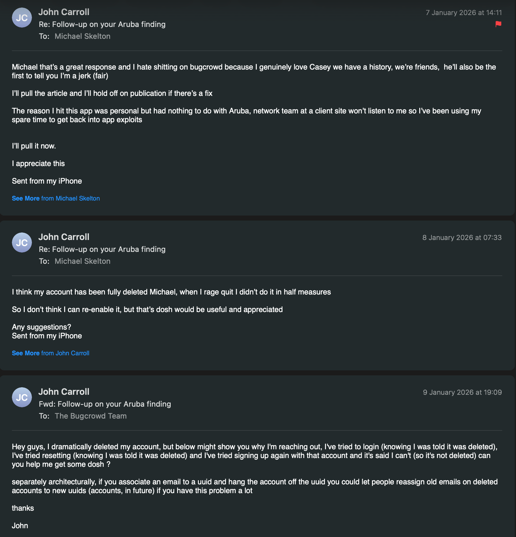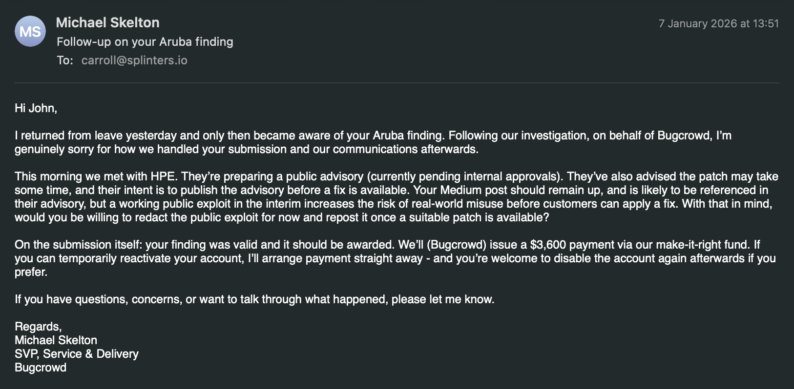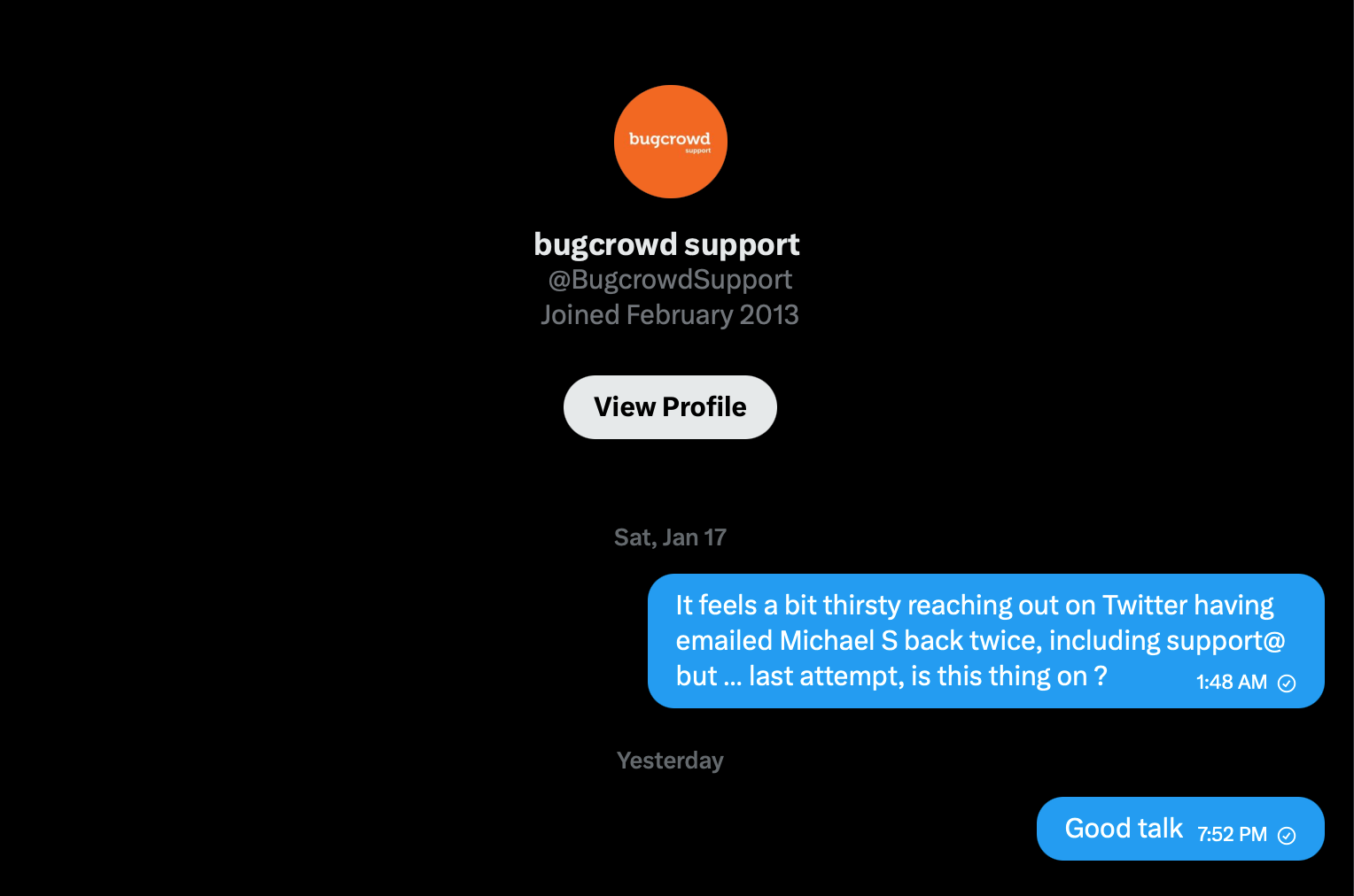 A few days pass and I get a new email from Michael Skelton, he's a good security professional, he's Bugcrowds SVP, Service & Delivery, here's the conversation:
