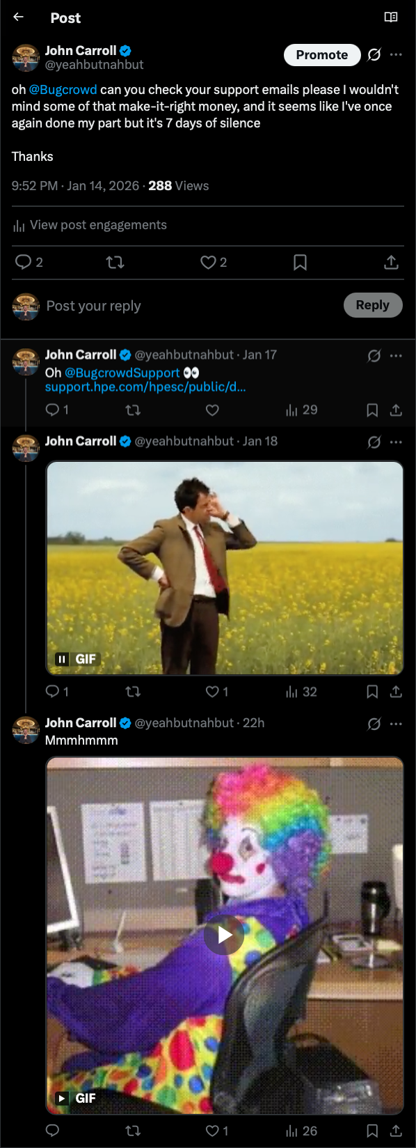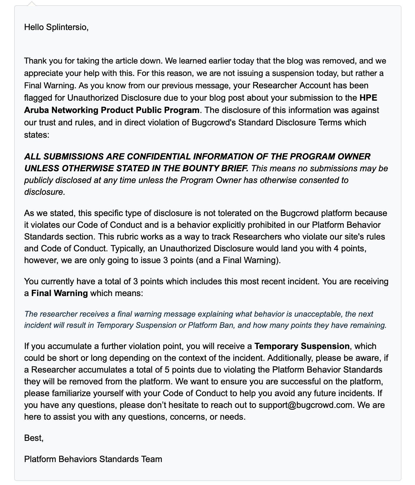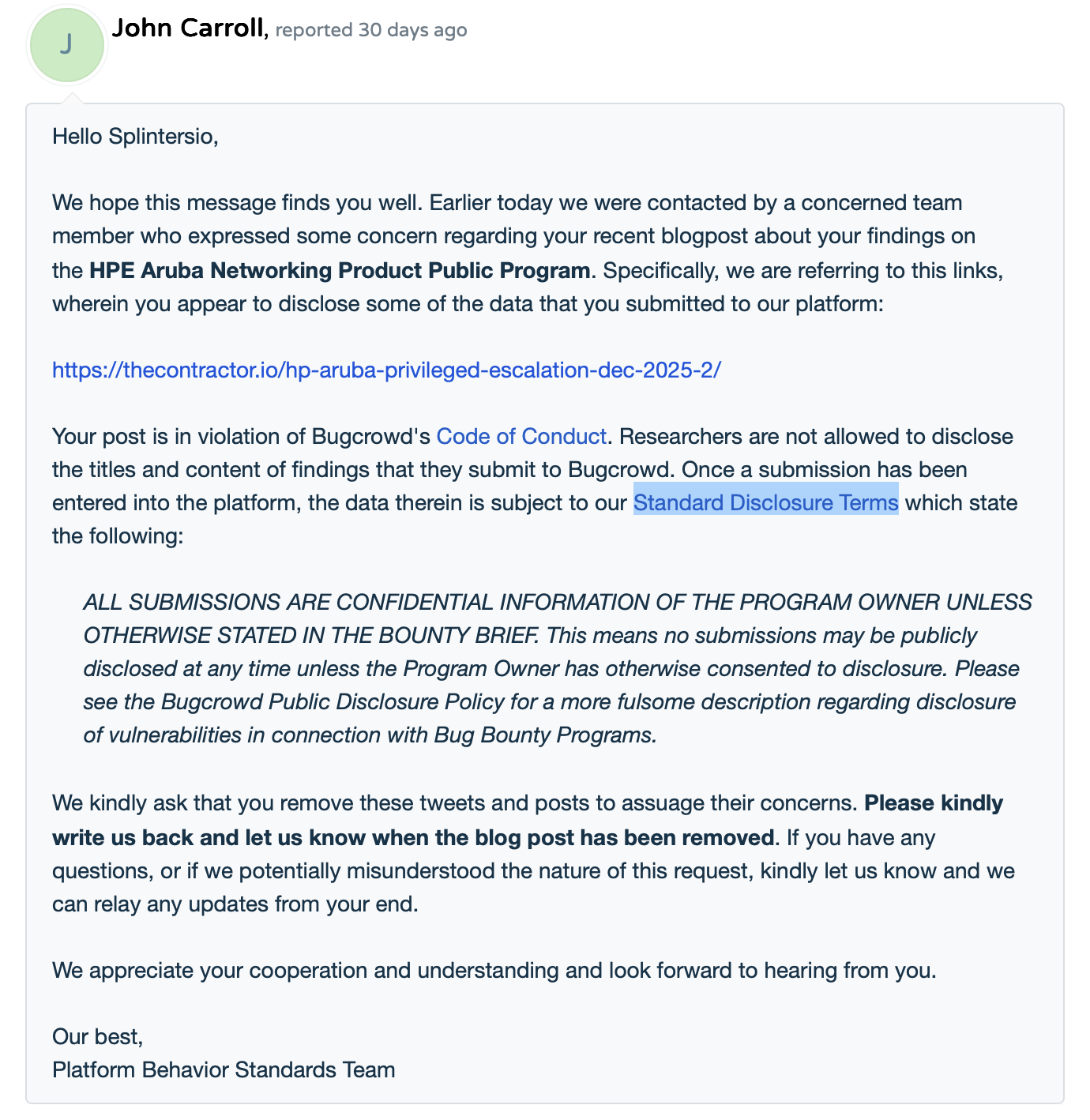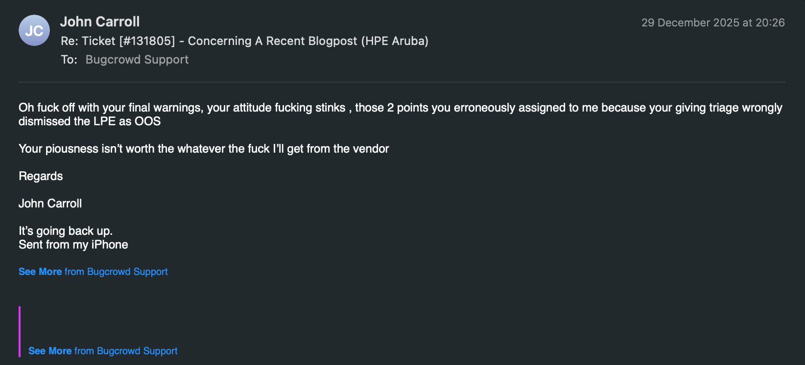 A few days pass and I get a new email from Michael Skelton, he's a good security professional, he's Bugcrowds SVP, Service & Delivery, here's the conversation:
